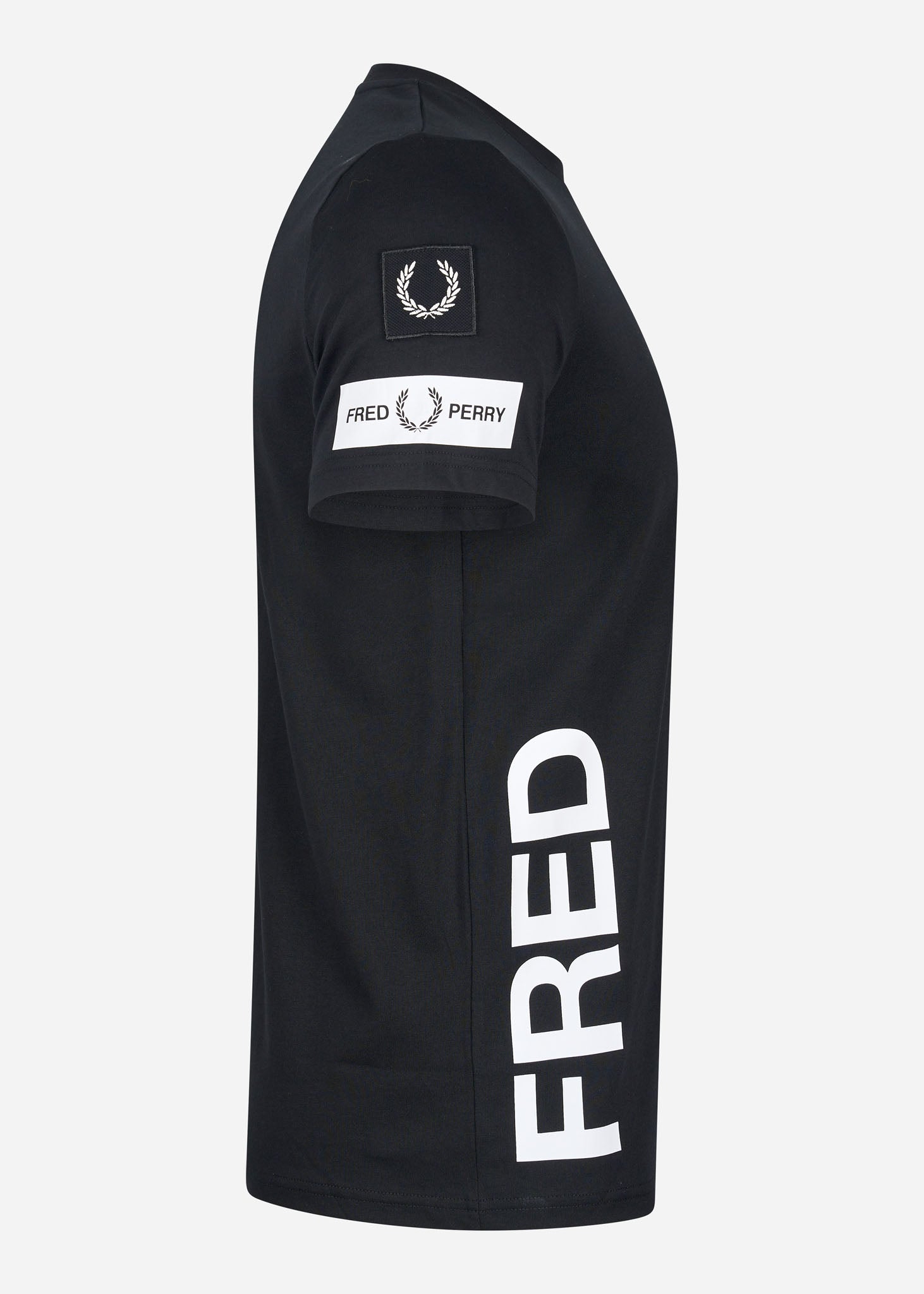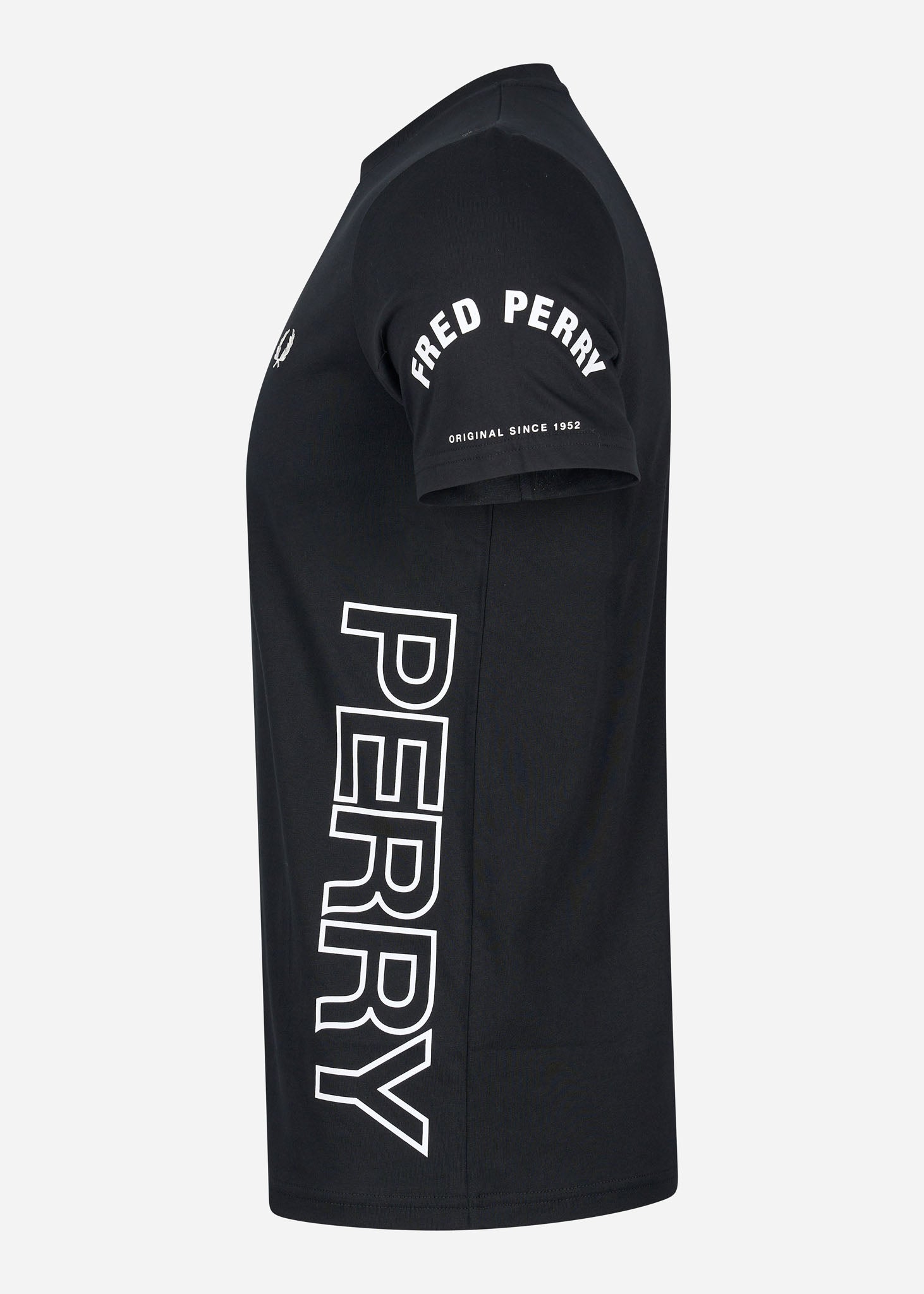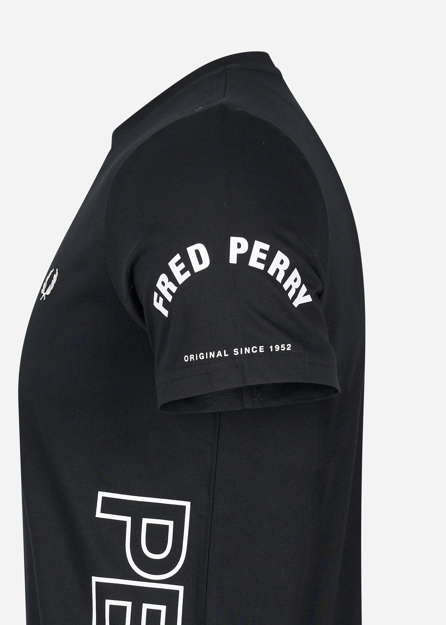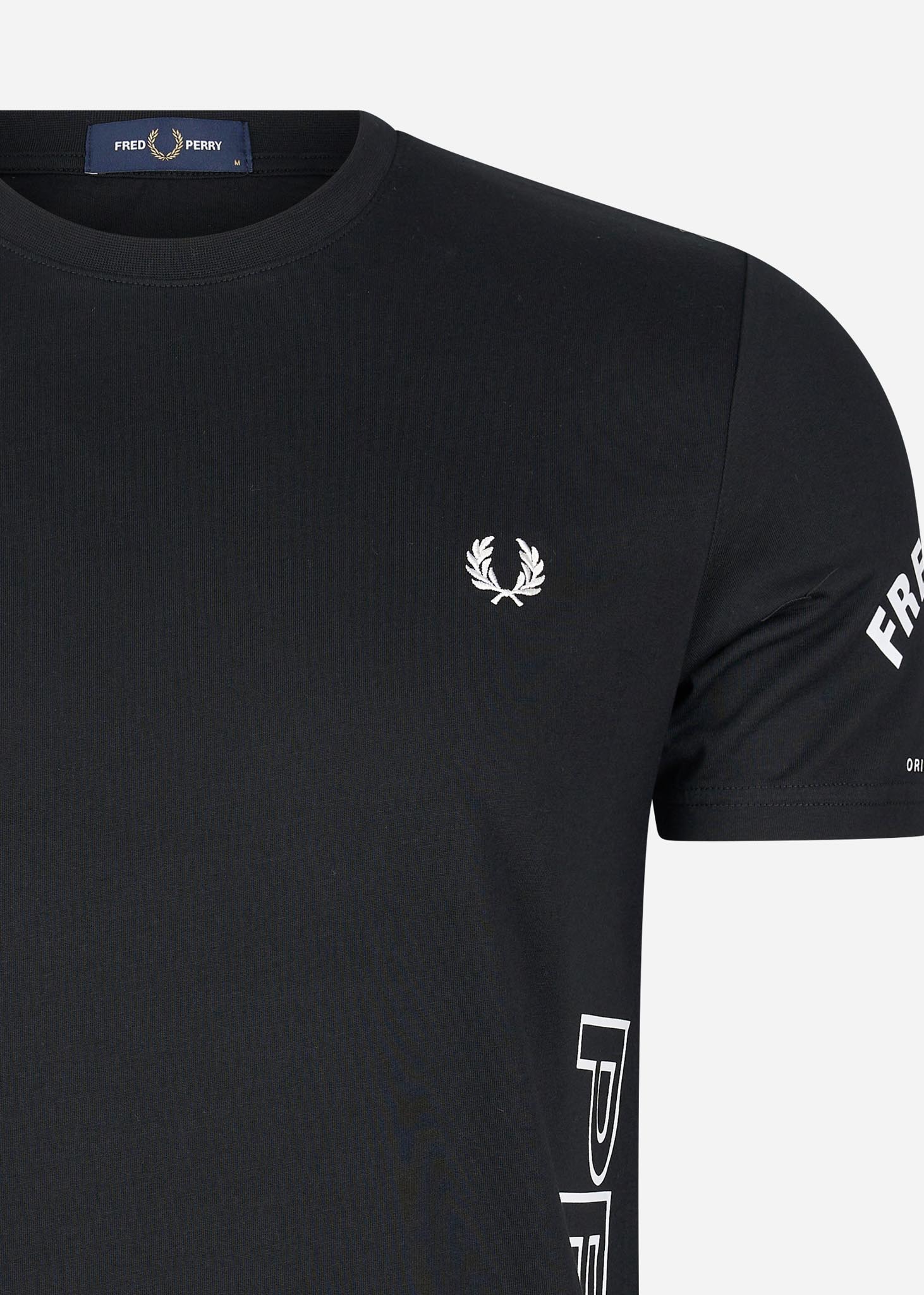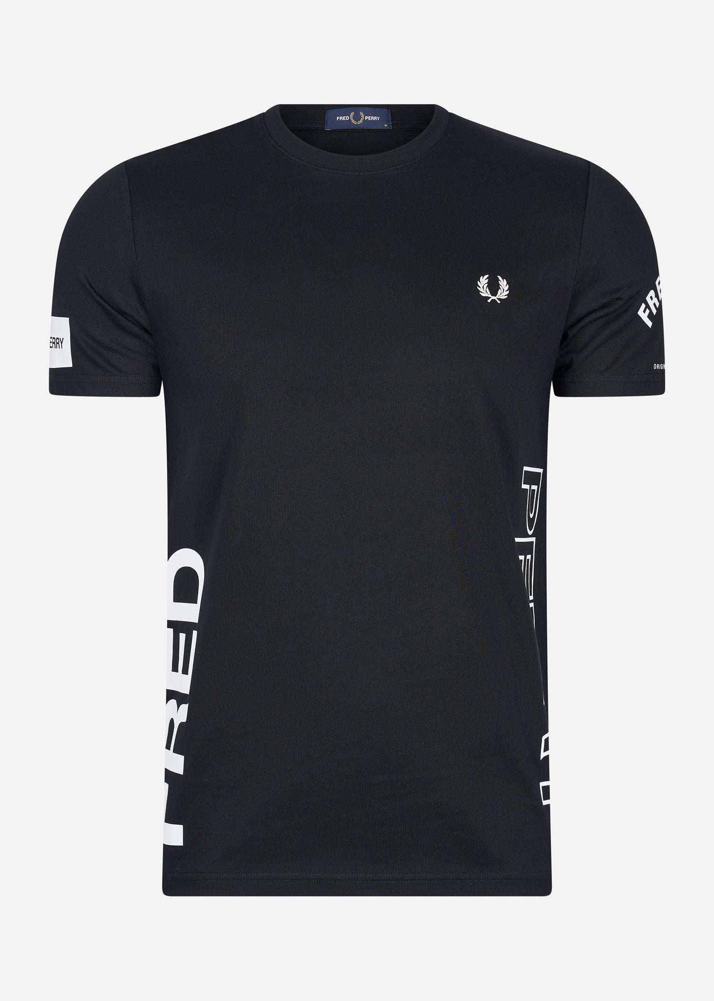 Het Bold Branding T-shirt van Fred Perry is door de vele details uniek en enorm stijlvol. Op beide mouwen zijn merkuitingen van Fred Perry in verschillende uitvoeringen te zien. Ook is de merknaam "Fred Perry" op de zijkanten te lezen. Daarnaast is op de linkerborst de herkenbare lauwerenkrans van Fred Perry geborduurd. Dit exclusieve t-shirt is de enige in zijn soort.