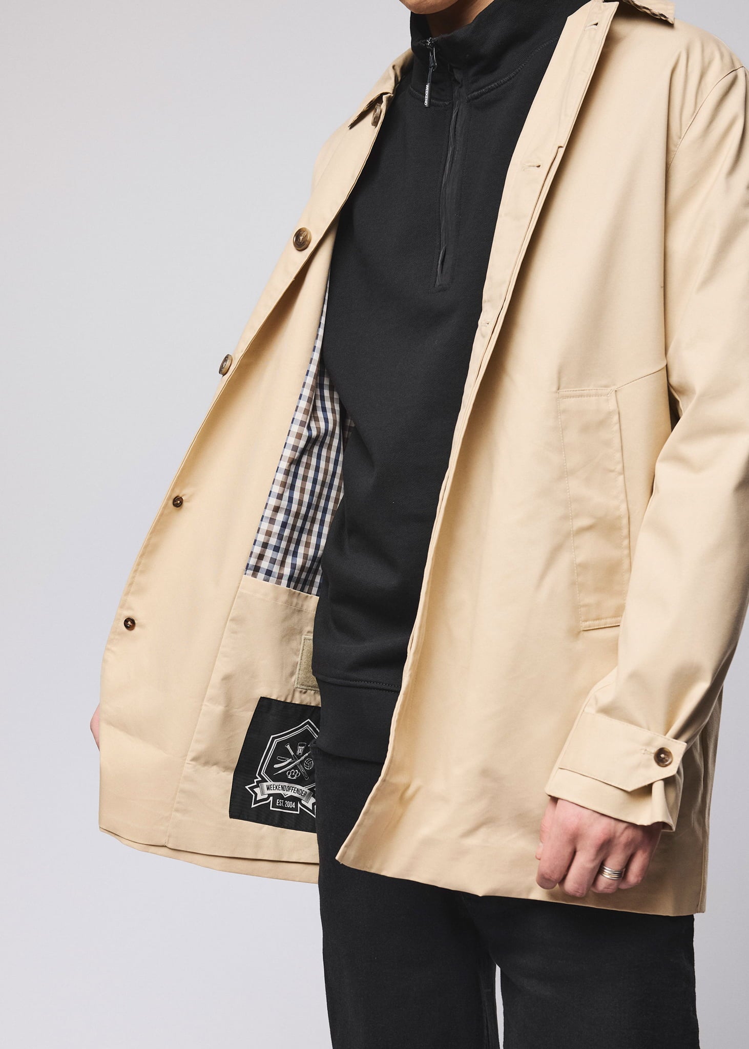 De Mid Length Mac is een klassieke overcoat met een moderne twist. Gemaakt van duurzaam twill met een subtiele glans en behandeld om waterafstotend te zijn. Een dunnere jas die je het hele jaar door kunt dragen, strak en tijdloos afgewerkt met de herkenbare Weekend Offender details.