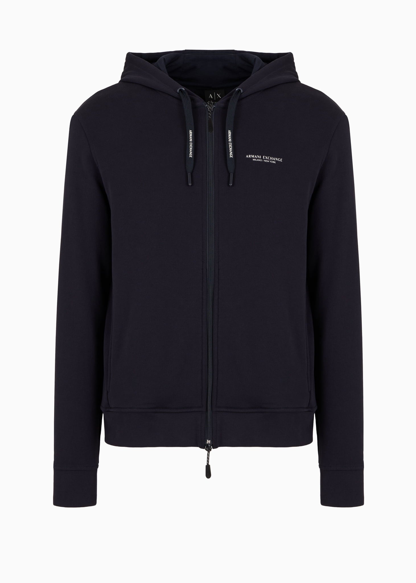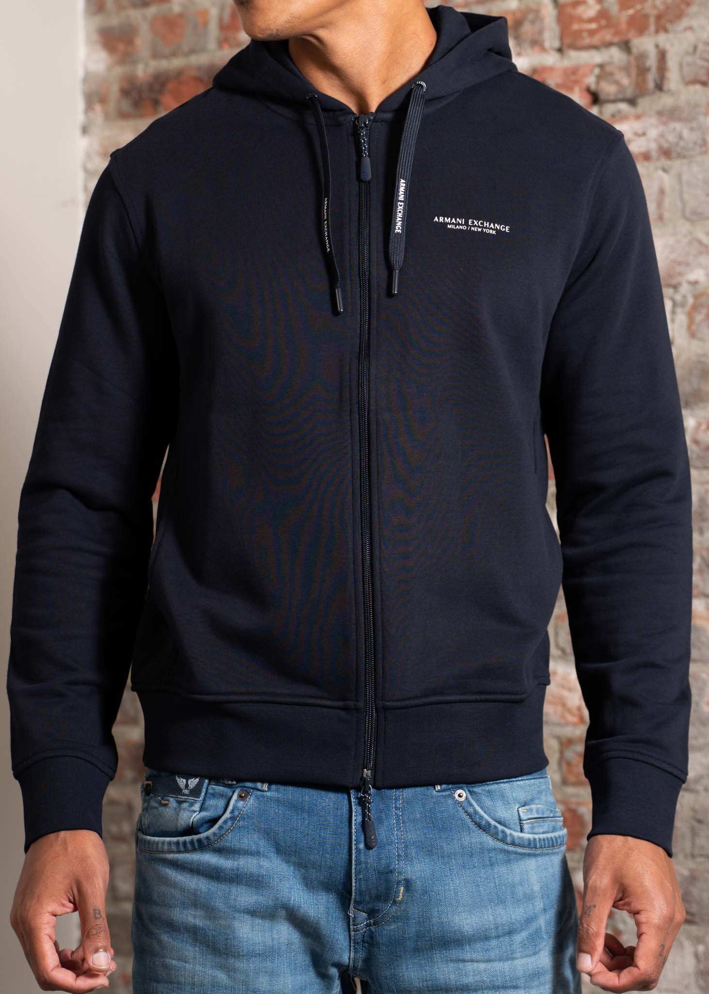 Sportief vest van zacht stretchkatoen, ontworpen voor dagelijks comfort. Het vest heeft een verstelbare capuchon met trekkoorden, een centrale ritssluiting en zijzakken. Afgewerkt met elastische ribboorden en een subtiel Armani Exchange logo voor een strakke, minimalistische look.